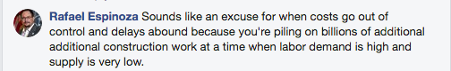 On Facebook, Councilman Rafael Espinoza suggested that the mayor’s comments might be setting up an excuse for project costs that go out of control. What do you make of that?