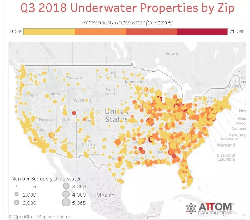 According to the folks at Attom Data, who’ve just released a new report about home equity during the third quarter of 2018, a home is considered to be seriously underwater when the combined balance of loans is at least 25 percent higher than the property’s estimated market value.