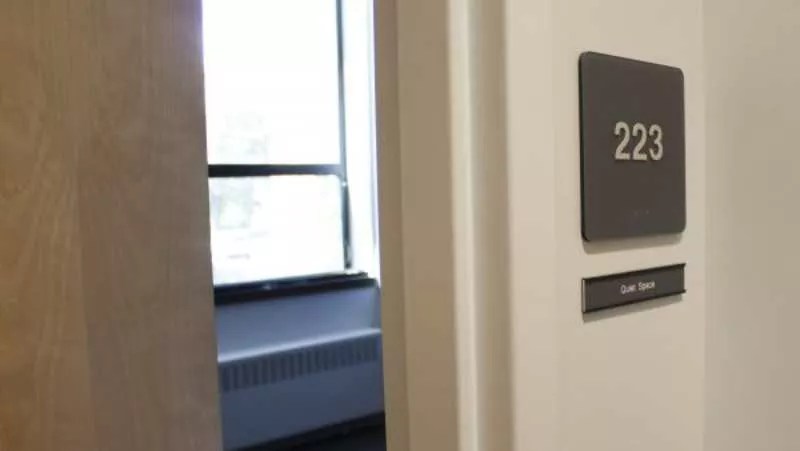 The reflection room at CU Boulder’s SECA Lounge is labeled a “quiet space.”