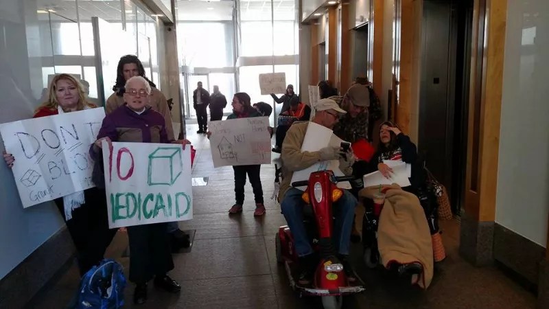 Original post, 6:54 a.m. March 9: At 8:30 a.m. today, March 9, eighteen disability-rights protesters cited during a demonstration against repealing the Affordable Care Act at Senator Cory Gardner’s downtown Denver office earlier this year will make their first court appearance.