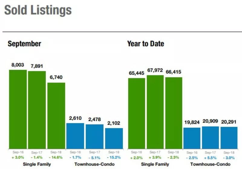 The supply of single-family homes is estimated to last 2.6 months, with townhouses and condos registering at 2.2 months. Meanwhile, the active listings in September for single-family homes (19,390) and townhouses and condos (5,005) represent drop-offs of 9.2 percent and 8.4 percent from the prior year.