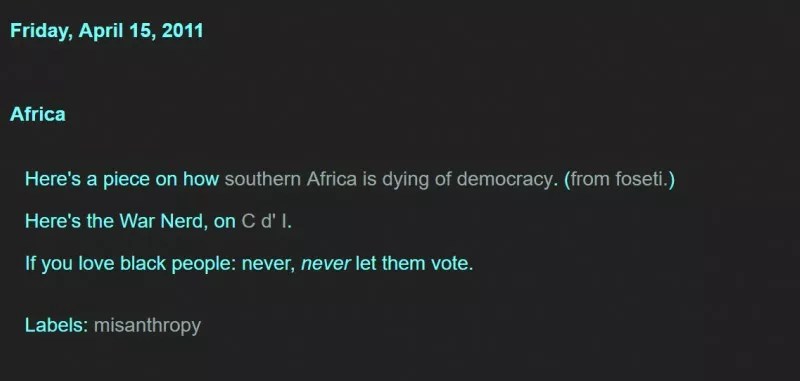 Plenty of folks would after checking out blurbs like the following, from 2011, in which he writes, “If you love black people: never, never let them vote.”