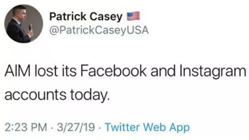 The tweet in which Patrick Casey, who led Identity Evropa and plays the same role with American Identity Movement, announced that Facebook and Instagram had yanked AIM’s privileges. He remains on Twitter at this writing, too.
