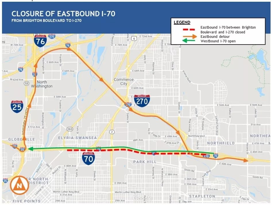 That eastbound section of I-70 is being closed this weekend for what the Colorado Department of Transportation describes as “final paving operations” prior to wrapping up the latest phase of the Central 70 project – the three miles of highway between Colorado Boulevard and Quebec Street. The westbound I-70 closure will get under way at 10 p.m. on Friday, July 23, and continue through 5 a.m. on Monday, July 26.