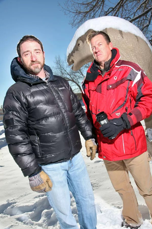 Eric Brown (left) and Randy Stafford of Dinosaur Ridge Neighbors question the role pro-growth forces in county government played in designating the area for commercial use.