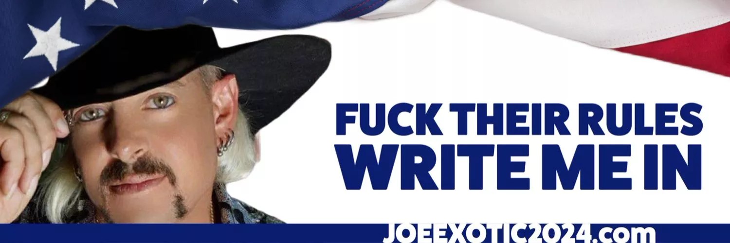 “This is how America elections are rigged. Biden nor the Democrats want my name Joe Exotic on the ballot because I am more popular than most people think and it would force President Biden to answer my questions and debate me,” he adds. “The Democrat party in Colorado thinks ignoring me will make me go away, but they’re wrong. I plan to push the last two months hard to be written in if they like it or not. America must take a stand against rigged elections.”