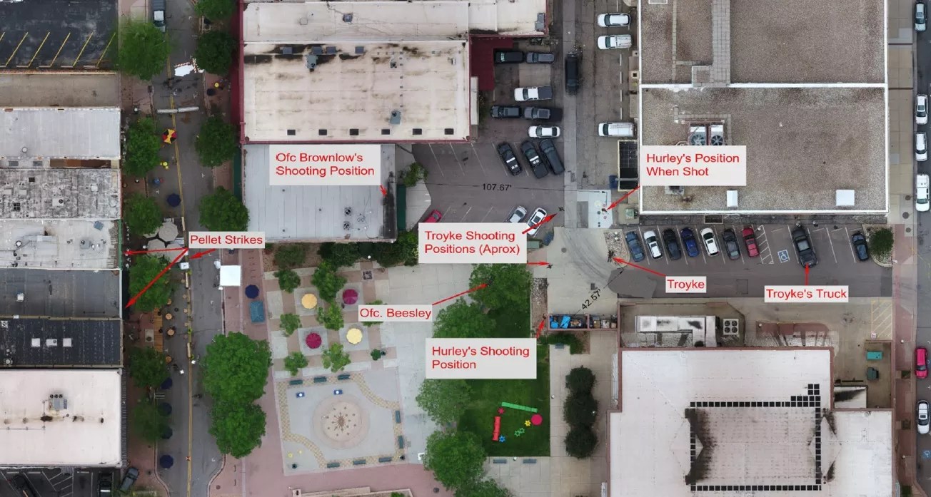 Shortly thereafter, King continues, Hurley came into view, carrying “a similar rifle as the man in black, as well as an additional handgun” – and he “looked intent on fixing or loading the rifle.” Hurley’s pause “gave an opportunity to law enforcement that the man in black had not – John Hurley was still, highly visible, with a wall of bricks behind him. If Officer Brownlow engaged before John Hurley had a chance to fix or reload his rifle or turn his attention on the lesser-armed Brownlow, Brownlow would fire towards a safe backdrop that would not jeopardize others.”