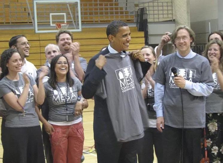Then-senator Barack Obama with Johnston in 2008 at Mapleton Expeditionary School of the Arts in Thornton.