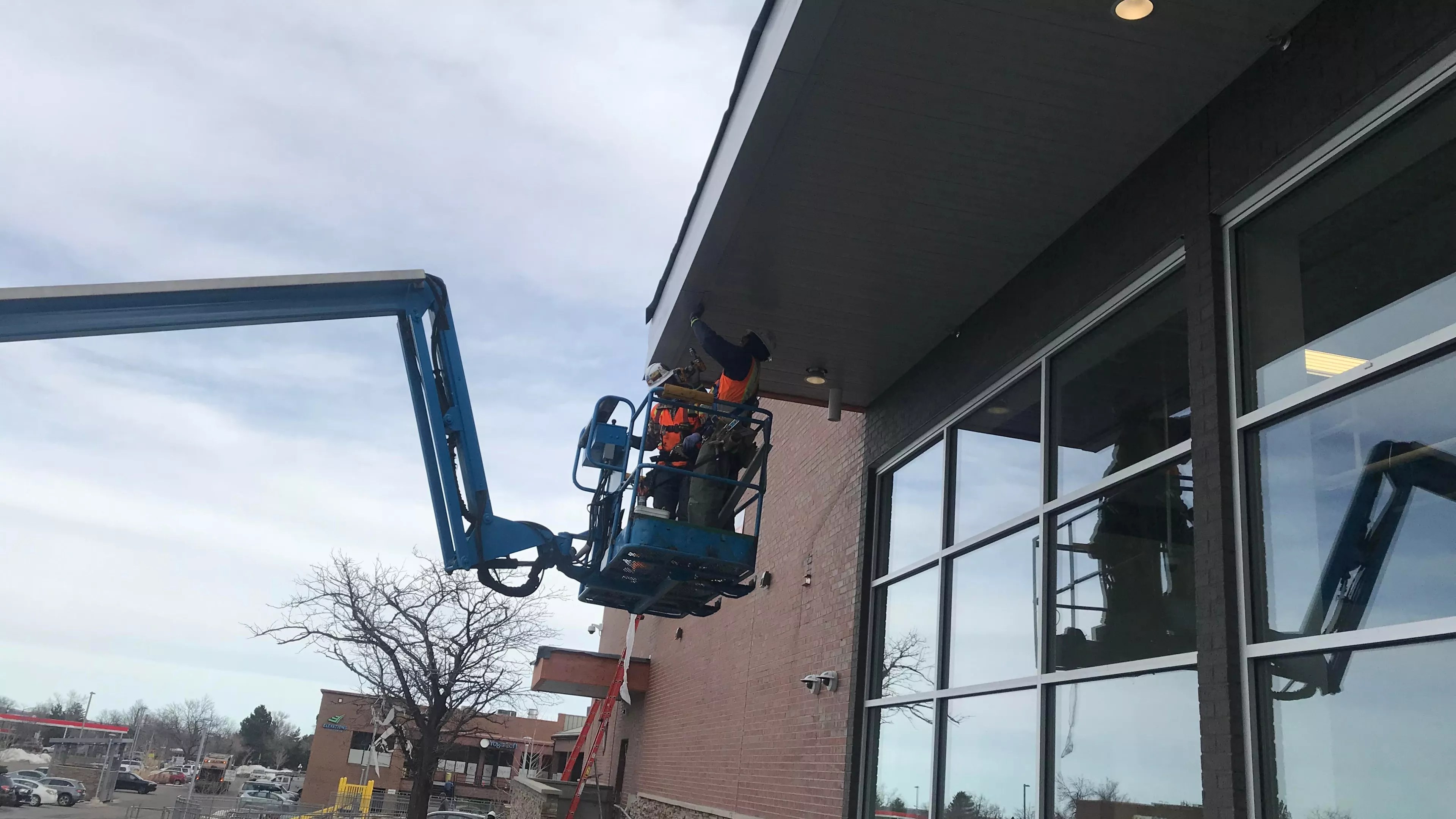 A construction worker getting elevated outside the Table Mesa King Soopers on January 12.