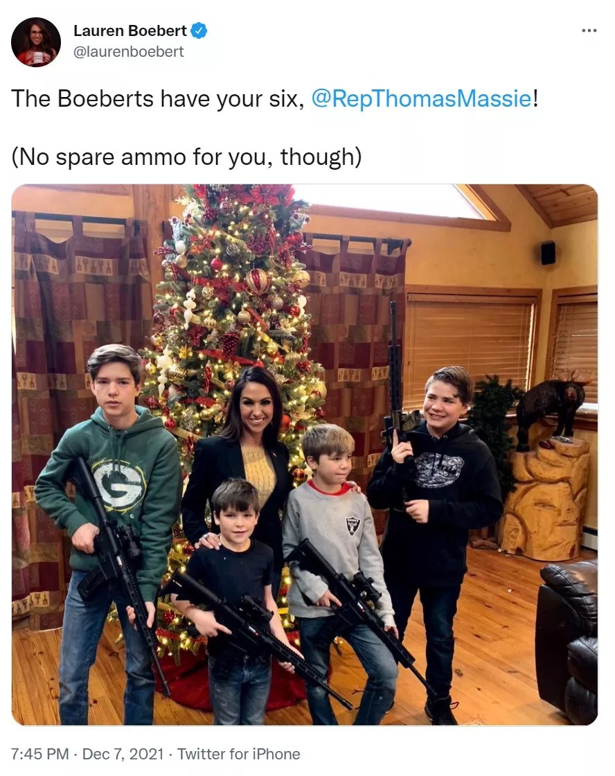 This tweet was in response to fellow Representative Thomas Massie, who only days after a Michigan teen killed four and wounded seven – in yet another of the school shootings that have tragically become so endemic to America – posted a Christmas card with the whole family grinning and carrying assault weapons. Massie’s Christmas wish was ghoulish enough; Boebert riding his bloodstained coattails by posting a heavily armed holiday wish with her own kids was just head-shakingly pathetic. Seriously, Republicans: Stop trying to ruin Christmas.