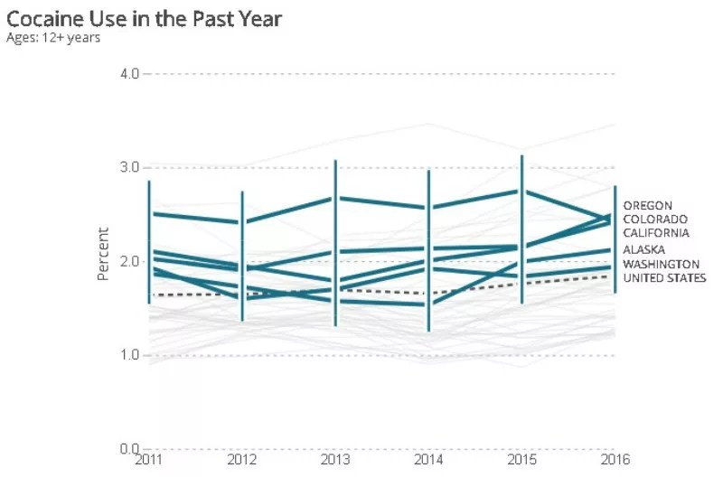 Specifically, the analysis looked at data from Colorado, Washington, Oregon and Alaska, all of which have legalized limited recreational marijuana sales, and then compared it to national averages. Data for the states was drawn from the federal Substance Abuse and Mental Health Services Administration’s National Survey on Drug Use and Heath, and other sources include the Centers for Disease Control and Prevention’s Behavioral Risk Factor Surveillance System and the Bureau of Labor Statistics.