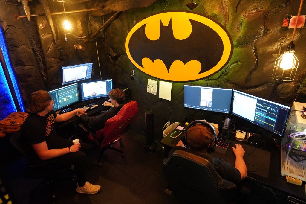One of two editing rooms in Beem’s warehouse, designed to look like the Batcave.