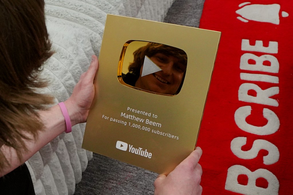 Beem’s view-count milestones are proudly displayed on the wall: one million views for a video building a massive Minecraft statue, ten million views for a video creating Squid Game props for MrBeast, and 100 million views for a video filling a house with water to make a giant fish tank.