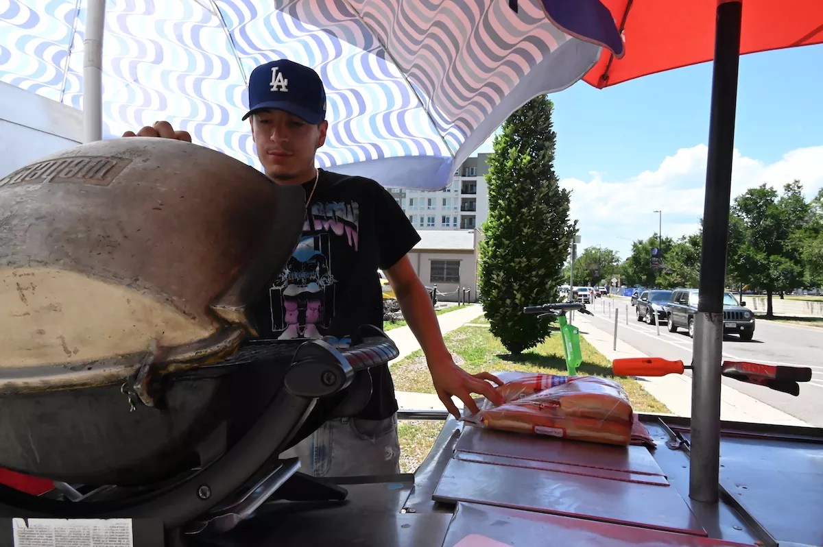Soon her parents were investing more in hot dog carts, which are cheap and easy to set up; Armas’s older sister followed her into the business. After she retired two years ago, Armas’s nephew, 23-year-old Marcello Rodriguez, took over the cart. He sells hots dogs, burgers and nachos just a few blocks from Armas at West 14th Avenue and Elati Street, right in front of the Lindsey-Flanigan Courthouse.