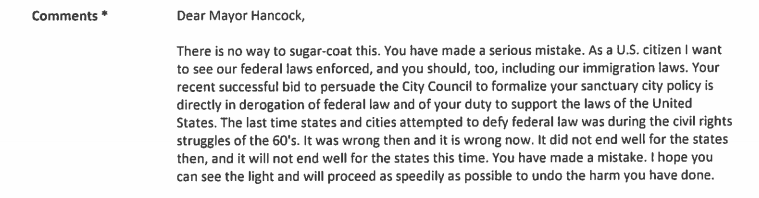 But one observation that can be made from the 104 messages we received in our open-records request is the ubiquity of the term “sanctuary city,” especially as used by those in opposition to the city’s recent actions on immigration. More than half of the messages use the words “sanctuary city.”
