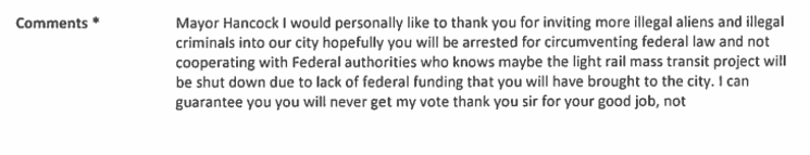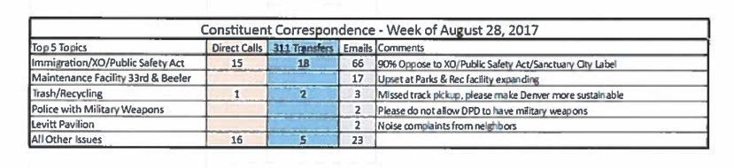 Below is the citizen feedback summary for the week preceding Mayor Hancock’s signing of the immigration bill, titled the Public Safety Enforcement Priorities Act, on August 31: