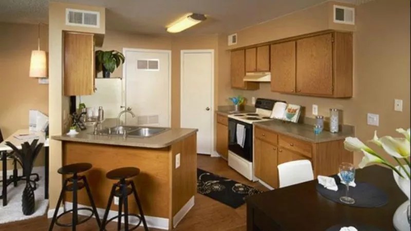 The kitchen and dining areas in the Aurora one-bedroom highlighted in the photo at the top of this post.