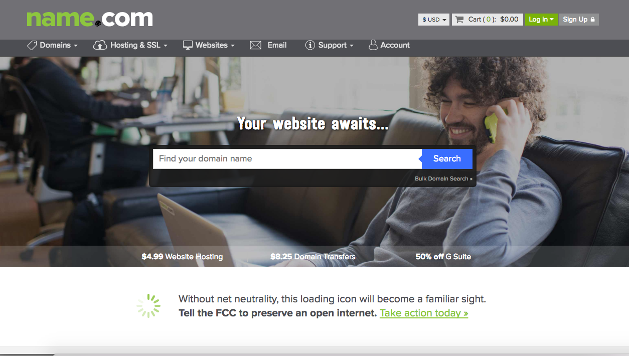 For the Day of Action, Name.com provided educational videos on its Facebook, Twitter and YouTube pages featuring local techies and employees talking about net neutrality and why they support it. (The videos are also available on Name.com’s blog.) And on July 12, a banner on the company’s home page displayed an image of a much-loathed loading spiral alongside the words, “Without net neutrality, this loading icon will become a familiar sight,” as well as information on how to share your comments to the FCC. That banner received 13,262 views on the Day of Action.