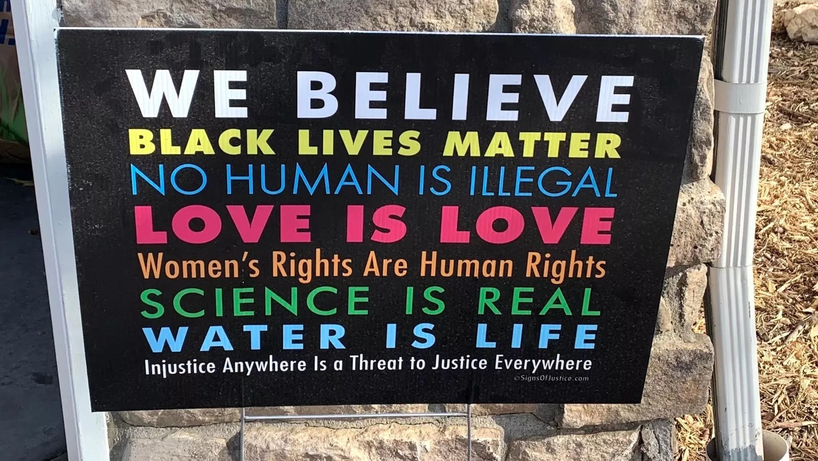 The message of the sign, seen at the top of this post, touches on several topics. It states: “We Believe Black Lives Matter, No Human Is Illegal, Love Is Love, Women’s Rights Are Human Rights, Science Is Real, Water Is Life, Injustice Anywhere Is a Threat to Justice Everywhere.”