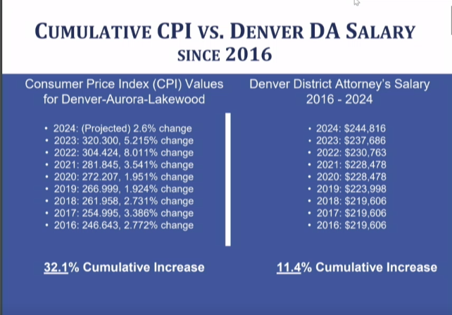 Councilmember Paul Kashmann agreed with Flynn that the slide Walsh used to illustrate inflation’s impact on the DA’s salary was “rough” before asking how well the Denver DA’s staff is paid compared to the staff of other DA’s offices in the state. Additionally, Kashmann asked if the state public defender’s salary would also be going up.