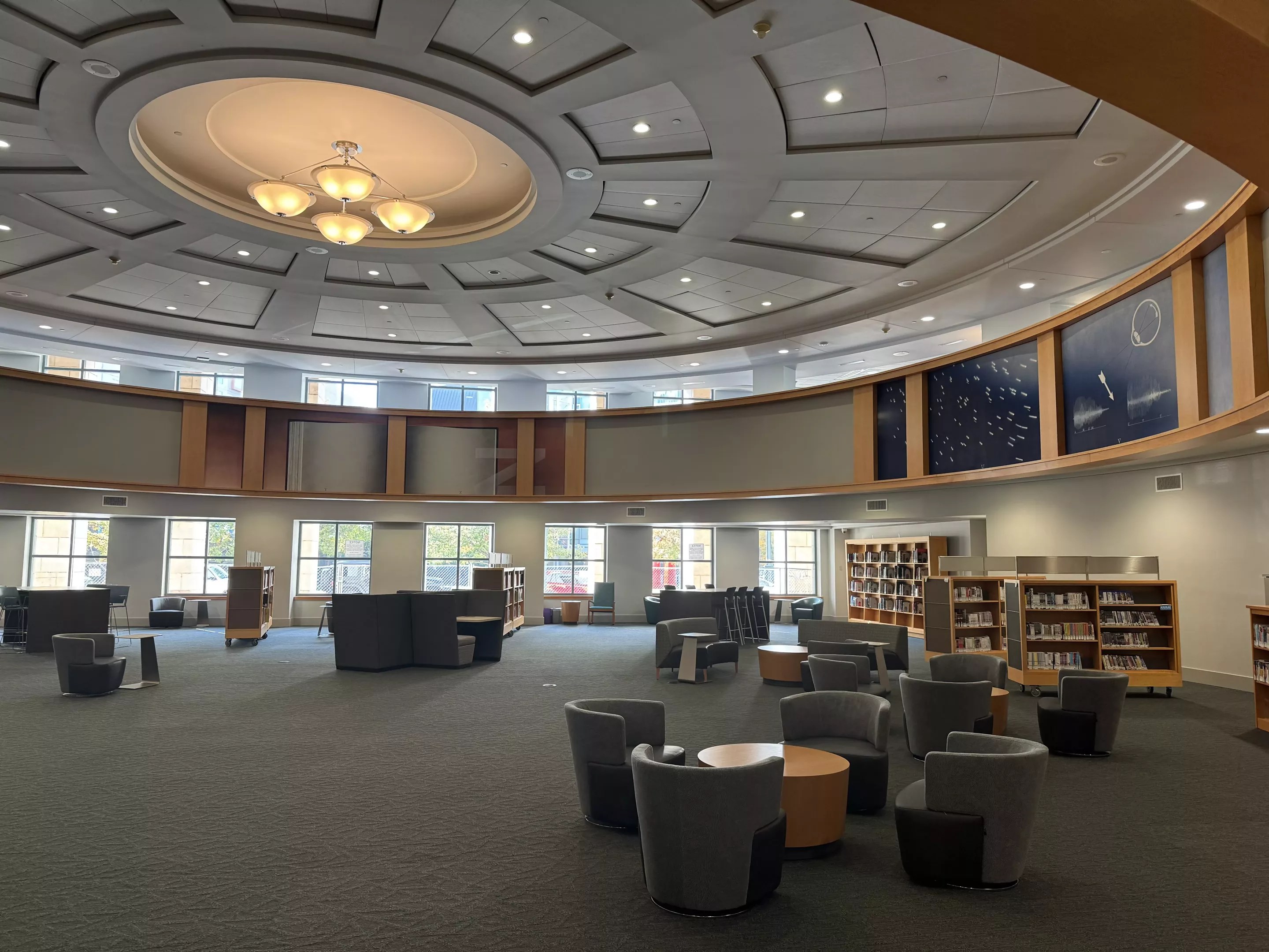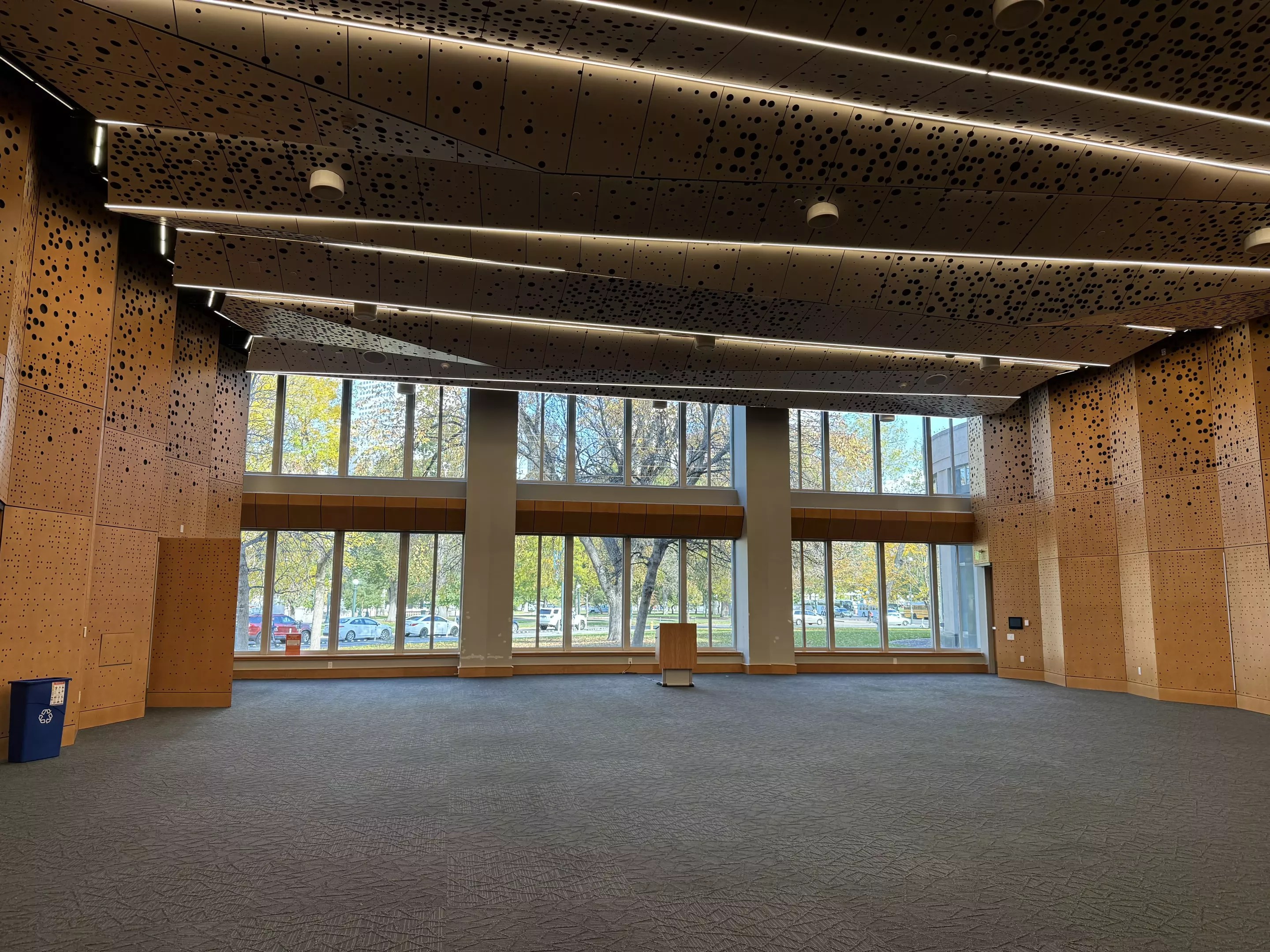Previously, the library’s event space was in the basement. The new event space, available for public bookings, features a multi-story view of Civic Center Park to the north of the library. Now the Park View space can be closed off for events, has its own entrance, can be open outside of library hours and has acoustic paneling on the walls and ceiling.