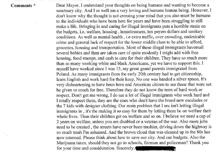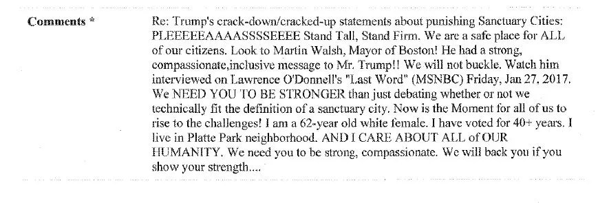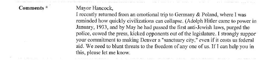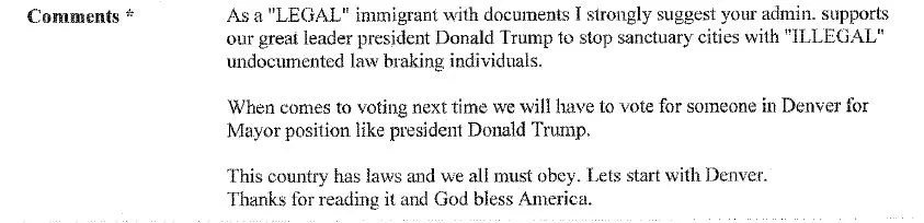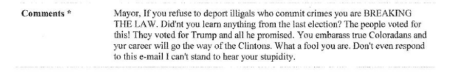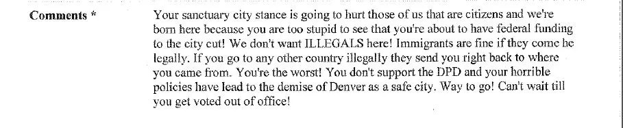 But responses from constituents who don’t agree with Hancock are also striking. They make the argument that Denver should not be shielding people who aren’t U.S. citizens. Some are outraged that Denver would gamble federal funding by protecting “illegals.”