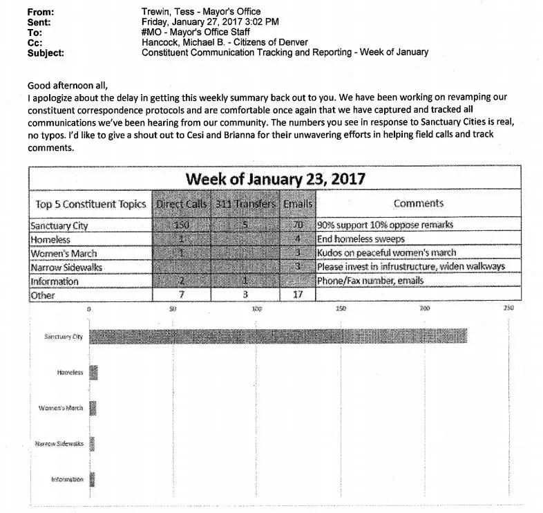 According to a summary sent to Hancock’s staff, the city received 155 calls and seventy e-mails related to sanctuary cities during the week of January 23.