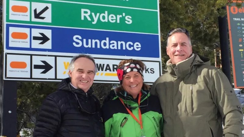 Eldora General Manager Brent Tregaskis, a fund contributor, poses alongside Cindy and Rick Johnson under a sign for a run rechristened in Ryder’s name.