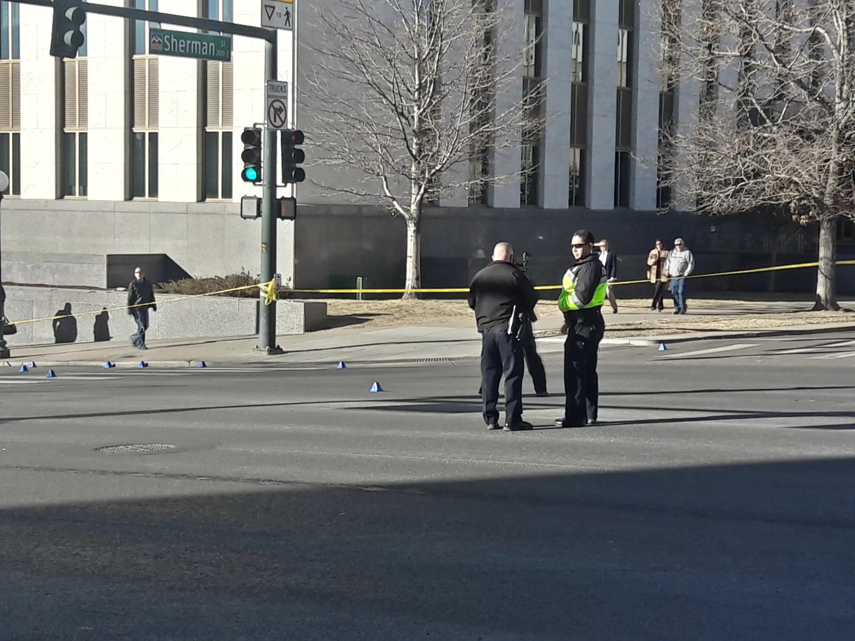Colorado State Patrol officers manned the scene, where at least seventeen small blue plastic triangles marking crime-scene evidence were scattered at the intersection of Sherman and Colfax.