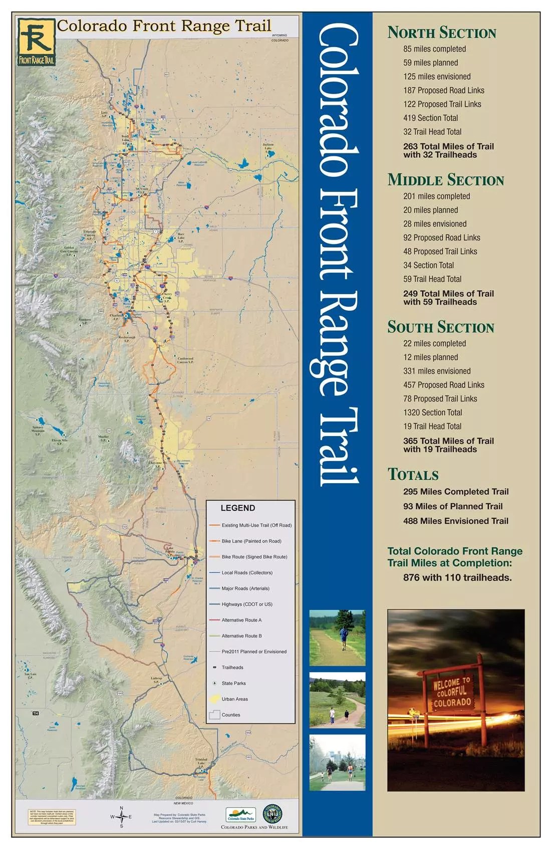 The vision of the Colorado Front Range Trail (CFRT) is to create a multi-use trail extending from the borders of Wyoming to New Mexico along the Front Range that links diverse communities, scenic landscapes, cultural and historic points, parks, open space and other attractions. While significant portions of the almost 900-mile trail have been completed, almost two-thirds of the trail remains to be constructed. Several segments have been identified as priorities, including:
