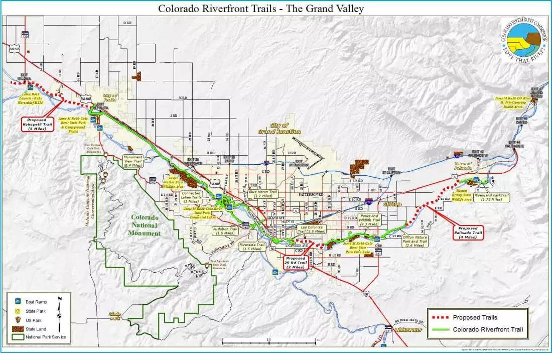 The Colorado Riverfront Trail extends from Palisade through the Grand Valley communities of Grand Junction and Fruita and terminates at the Kokopelli Trailhead outside of Loma. To date, 23 miles of the trail have been constructed, with 10 miles remaining to fully complete the Riverfront Trail spine. Once completed, the continuous trail system will create a non-motorized, multi-modal transportation corridor that will act as an economic driver across the region and will provide access to additional recreation amenities such as the world-class mountain-biking opportunities at the Kokopelli trails. Portions of the trail will include a natural-surface single-track trail alongside the concrete trail to provide for alternative surfaces.
