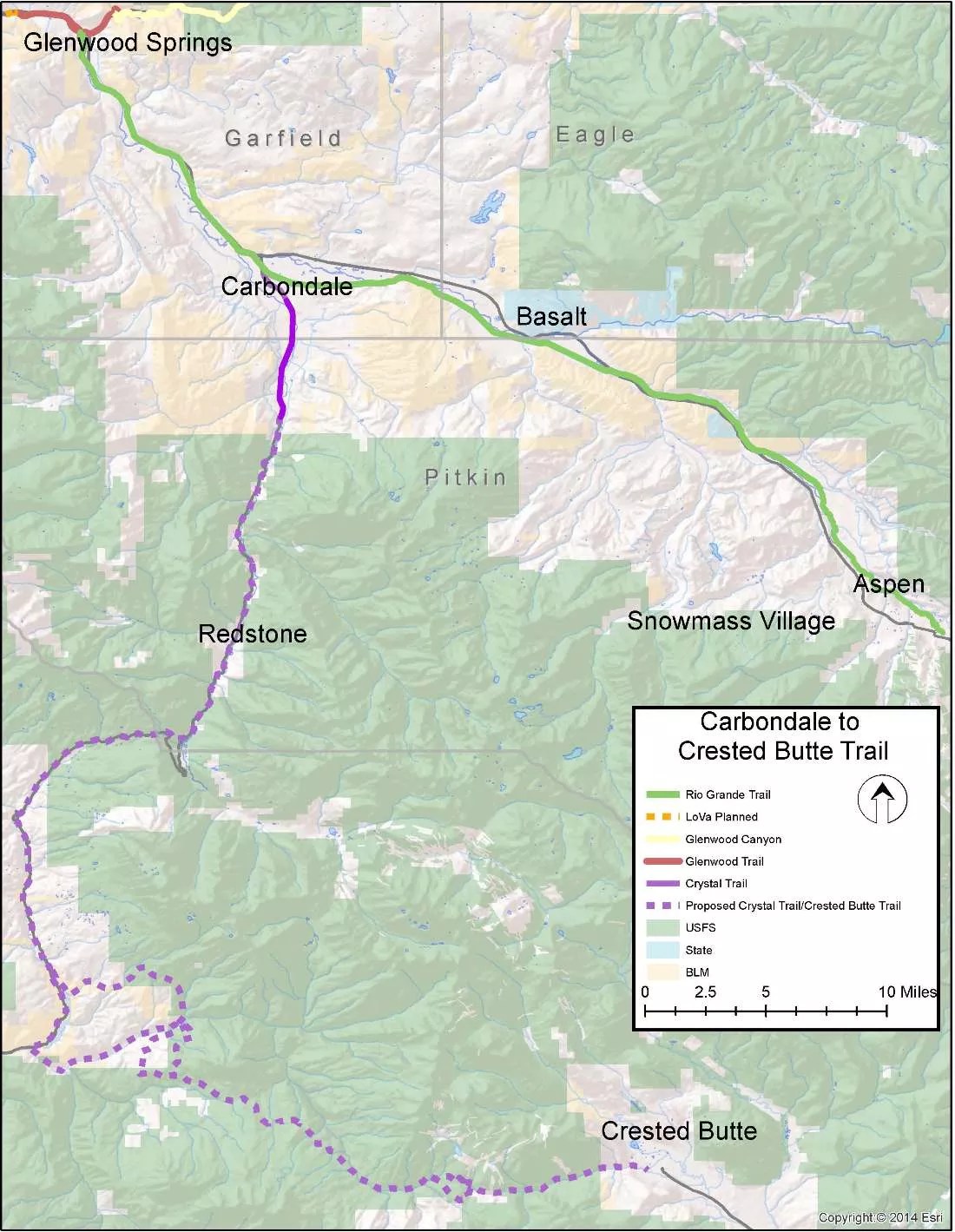 The 74-mile Crested Butte to Carbondale Trail was first envisioned in 2004 to provide both paved and natural-surface trail opportunities to the communities of Carbondale, Redstone and Crested Butte. The first five-mile segment of the trail is complete, linking Carbondale to the existing Rio Grande trail. The next step is to complete the 17-mile Crystal Valley segment, linking the trail to Redstone and McClure Pass.