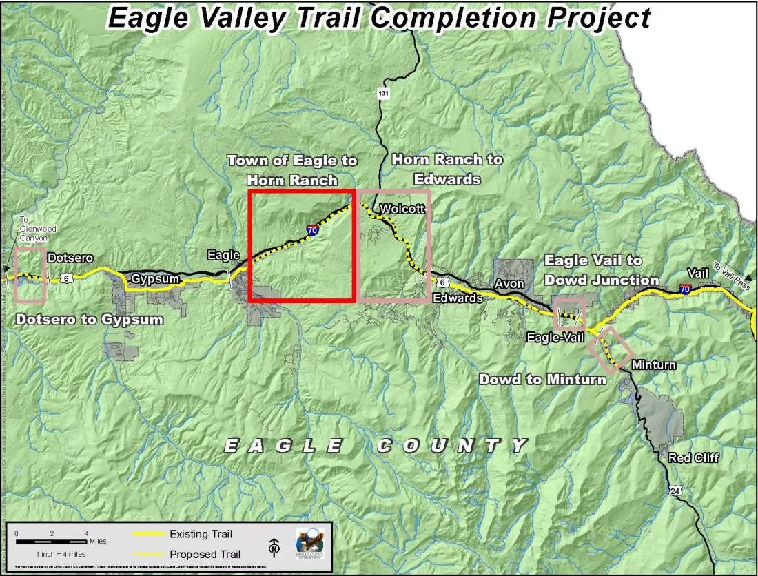When complete, the Eagle Valley Trail will be a 63-mile paved trail that travels the length of the Eagle River Valley, from Dotsero to the Town of Minturn. The trail will connect to the Gore Valley Trail through Vail and the Vail Pass bike path. Approximately 37 miles of the trail are complete and in use today. The next priority segment is seven miles from the Town of Eagle to the 287-acre Horn Ranch Open Space Park – connecting users to recreational opportunities in the park as well as other nearby public lands.