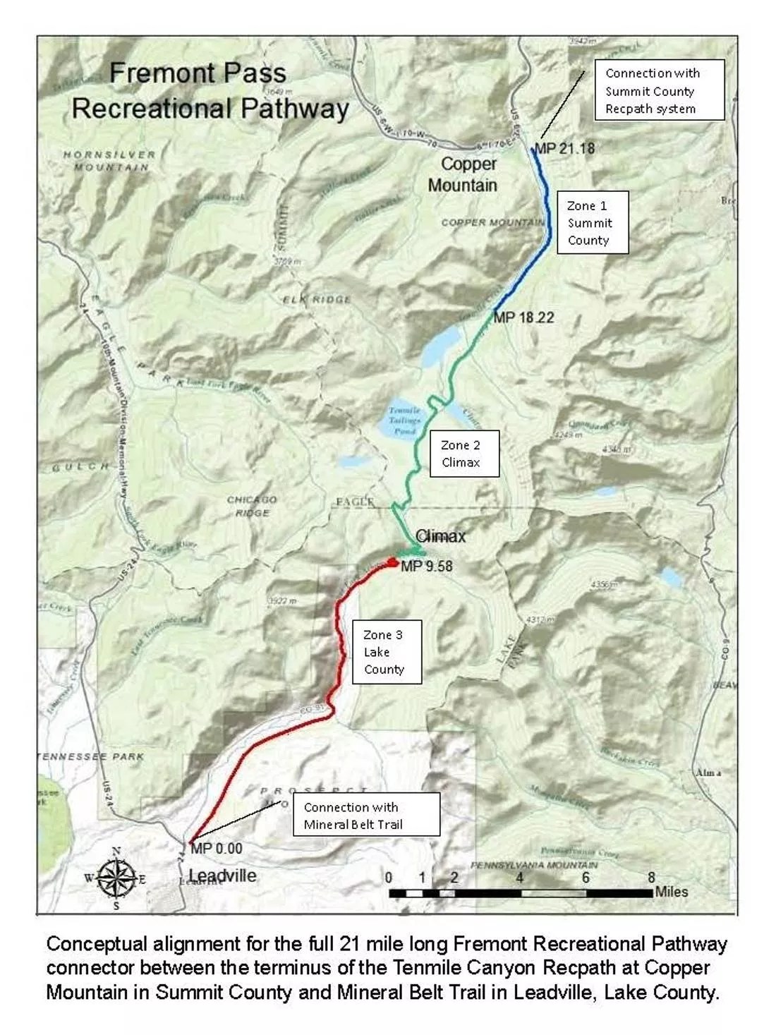 As envisioned, the 21-mile Fremont Pass Trail will parallel Highway 91 over Fremont Pass connecting the Summit County recreation path system at Copper Mountain with the Mineral Belt Trail in Leadville. The trail will serve as an important connector between Summit and Lake counties by offering regional connectivity throughout Colorado’s central mountains. An analysis by the U.S. Forest Service to assess environmental impacts will be necessary to advance the project, and proponents expect that process to begin in 2016.