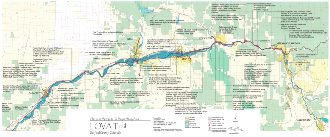 The Lower Valley (LoVa) Trail is a multi-use, non-motorized trail that will travel through the Colorado River Valley beginning in Glenwood Springs to connect the communities of New Castle, Silt, Rifle and Parachute. Once complete, the paved trail will end at the Mesa County line and also will connect to the existing Rio Grande and Glenwood Canyon Trails beginning in Glenwood Springs. This regional trail will enhance outdoor recreation opportunities, will provide a safe transportation alternative for residents, and will connect residents of Garfield County to existing trails systems. The vision of the LoVa trail began as a grassroots effort in 1999. The proposed 47-mile trail is divided into five connector segments, with the first priority for construction being the South Canyon Trail section. To date, two small sections within the South Canyon and localized trails within each community have been completed.