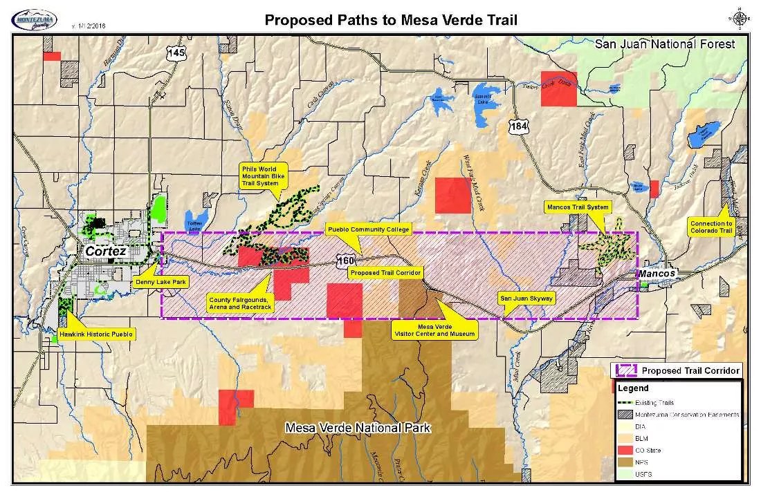 The Paths to Mesa Verde project would provide 16 miles of multi-modal linkages between the Town of Mancos, Mesa Verde National Park, Cortez High School, Southwest Colorado Community College, the Phil’s World Mountain Bike Trails System, and the Montezuma County Fairgrounds. The trail would act as a safe transportation route along the Highway 160 corridor and would spur economic development surrounding tourism, outdoor recreation and cultural resources. Proponents expect to identify a preferred alignment and complete the preliminary design work in 2016.