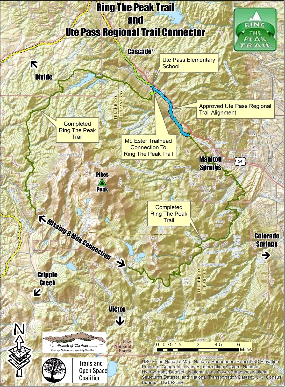 Ring the Peak is a natural-surface trail system planned to circumnavigate Pikes Peak and was first envisioned in the 1999 Pikes Peak Multi-Use Plan. Two trail gaps remain to close the almost 62-mile loop. The Ute Pass Regional Trail is a proposed 11-mile segment from Manitou Springs to the El Paso County line. Completing the remaining five miles of the Ute Pass trail would close the northeast gap of the Ring the Peak Trail. This segment would also provide a connection to the American Discovery Trail and the America the Beautiful Trail.