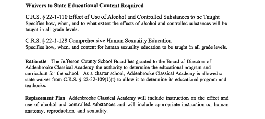 Addenbrooke Classical Academy, a preschool-12 charter school in Lakewood, simply writes in its replacement plan that the Jefferson County School Board granted the school authority to decide the curricula on these subjects, which will include “appropriate instruction on human anatomy, reproduction, and sexuality.”