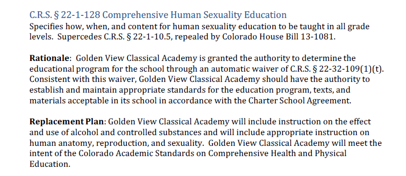 Golden View Classical Academy (GVCA), a K-11 charter school in Golden, also received waivers for both comprehensive human sexuality and alcohol and controlled-substance education. In its replacement plan, GVCA also emphasizes “appropriate” instruction on the subjects.