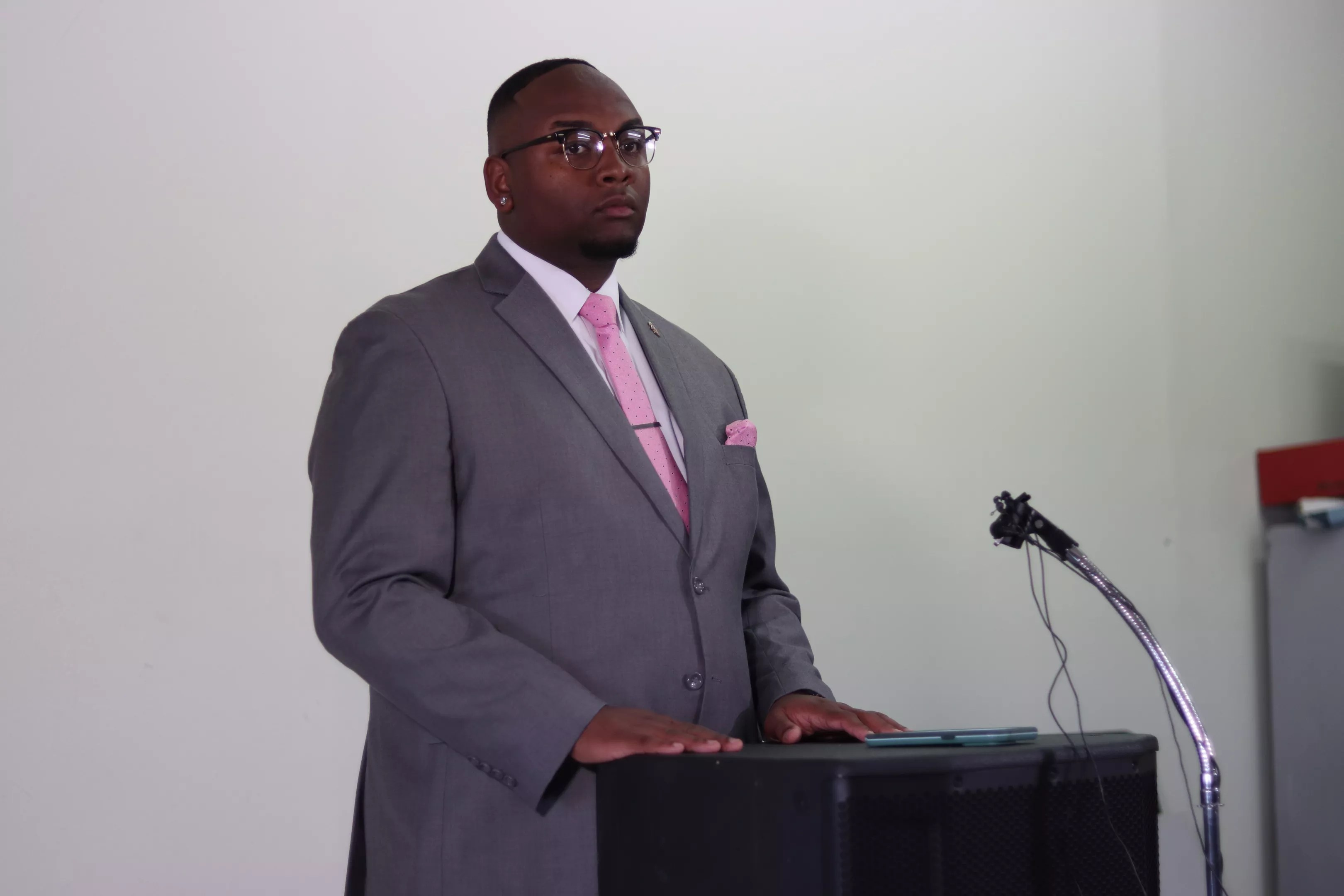 Denver School Board Vice President Auon'tai Anderson speaking at a press conference at Brother Jeff's Cultural Center.