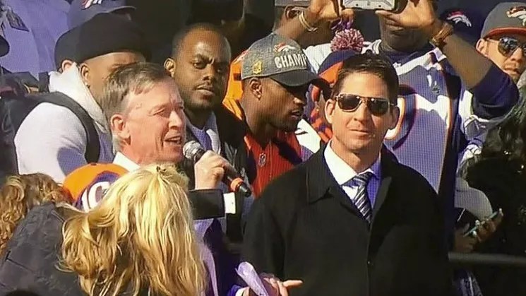 The departure of Ed McCaffrey (seen at the Broncos’ most recent Super Bowl victory celebration with Governor John Hickenlooper) opened the door for Lewis.
