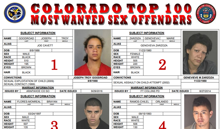 A screen capture from the current list of most wanted Colorado sex offenders.
