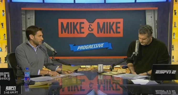 Mike Greenberg and Mike Golic during their ESPN2 broadcast following Romo’s November 2016 press conference.
