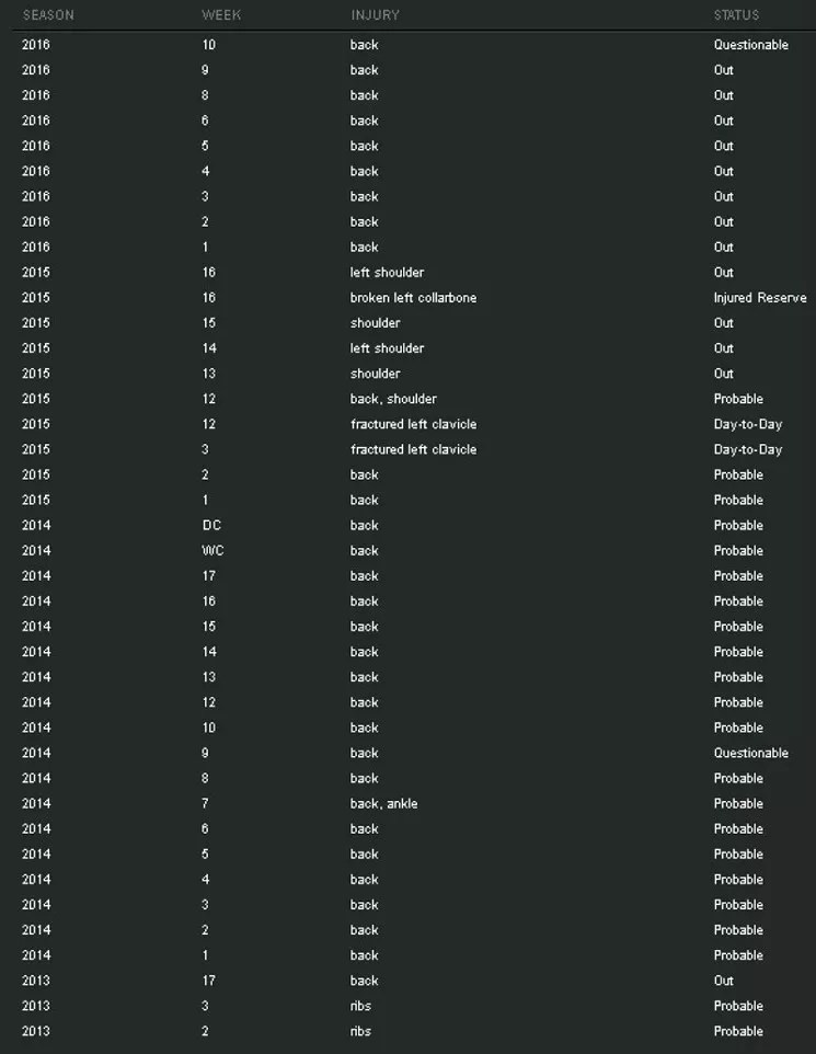 Quite simply, back problems are among the most difficult for NFL players to overcome. Just ask current Broncos DeMarcus Ware and Aqib Talib, both of whom have been dealing with back issues. Romo’s great when he’s on the field. Less so when he’s flat on his…well, you know.