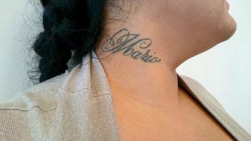 The woman whose photo is seen at the top of this post “has a tattoo on her neck – the name of a person she was formerly in a relationship with,” Smith says. “She received the tattoo really against her desire….”