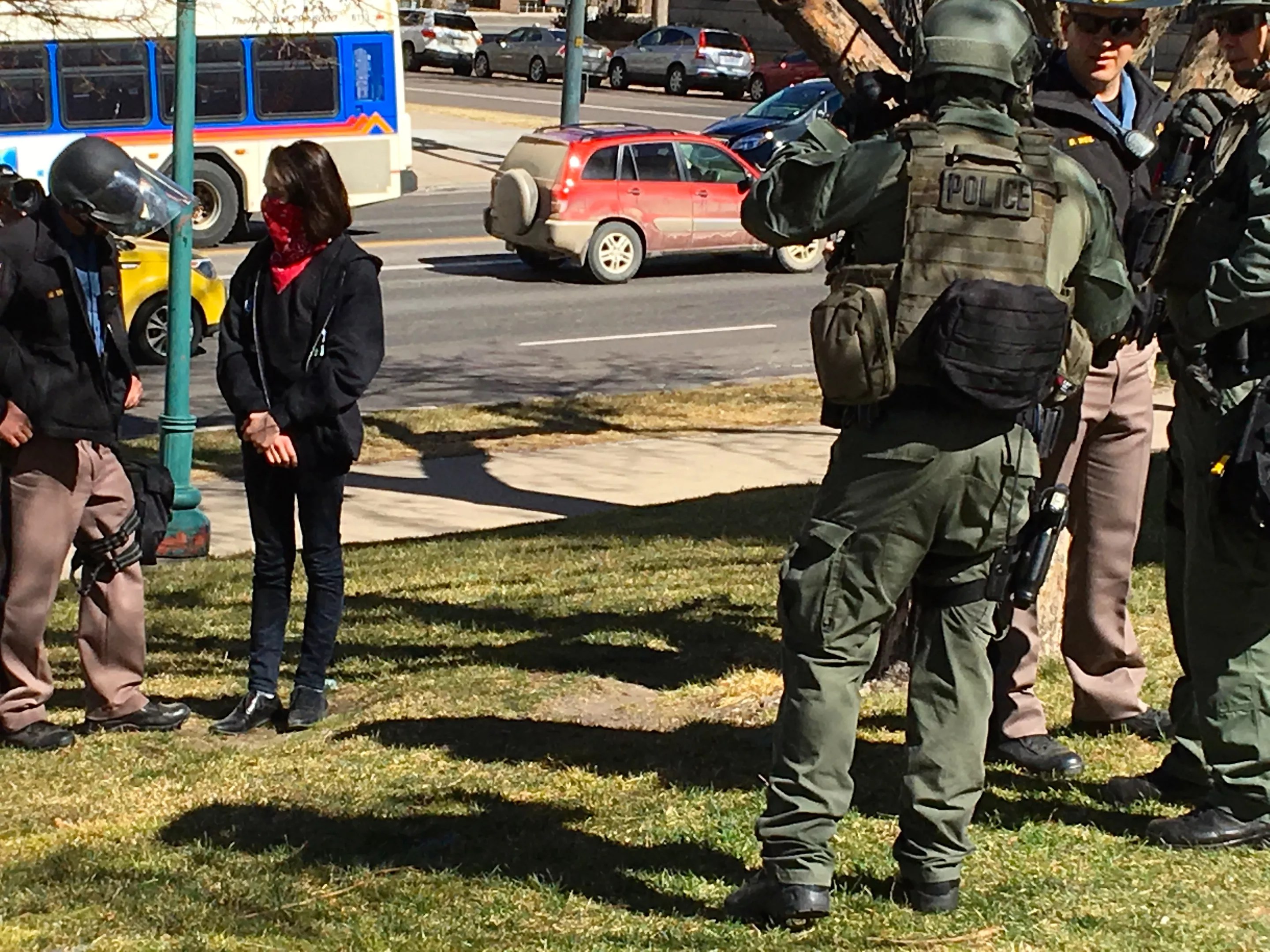 State Capitol police and Denver Police officers immediately formed a wall between the Trump rally and the approaching black bloc. As the rally continued, more and more officers would be called in to secure a perimeter around the Trump supporters. They included SWAT officers and riot police armed with specialized guns to disperse tear gas canisters. By noon, there was a one-to-one ratio of black-bloc protesters and law enforcement personnel.