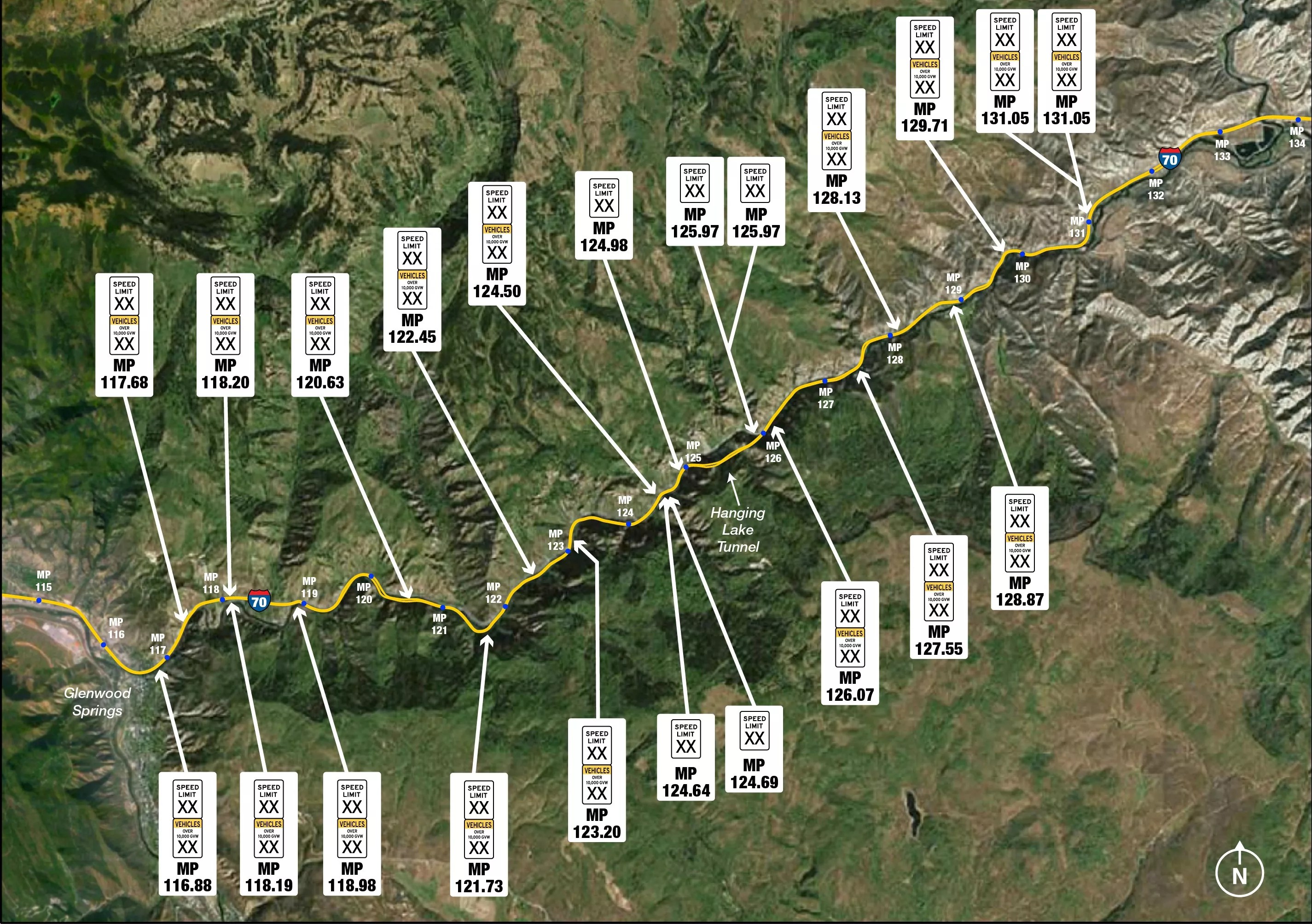 A map showing the locations where signs will be placed along the Glenwood Canyon route.