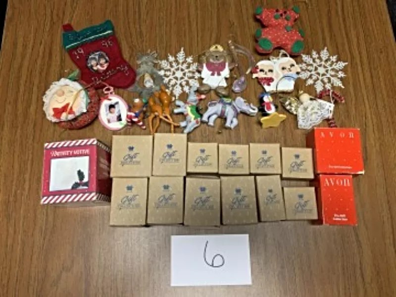 A collection of Christmas ornaments, as well as two Avon product boxes that no doubt contain incredible treasures – or Avon products.