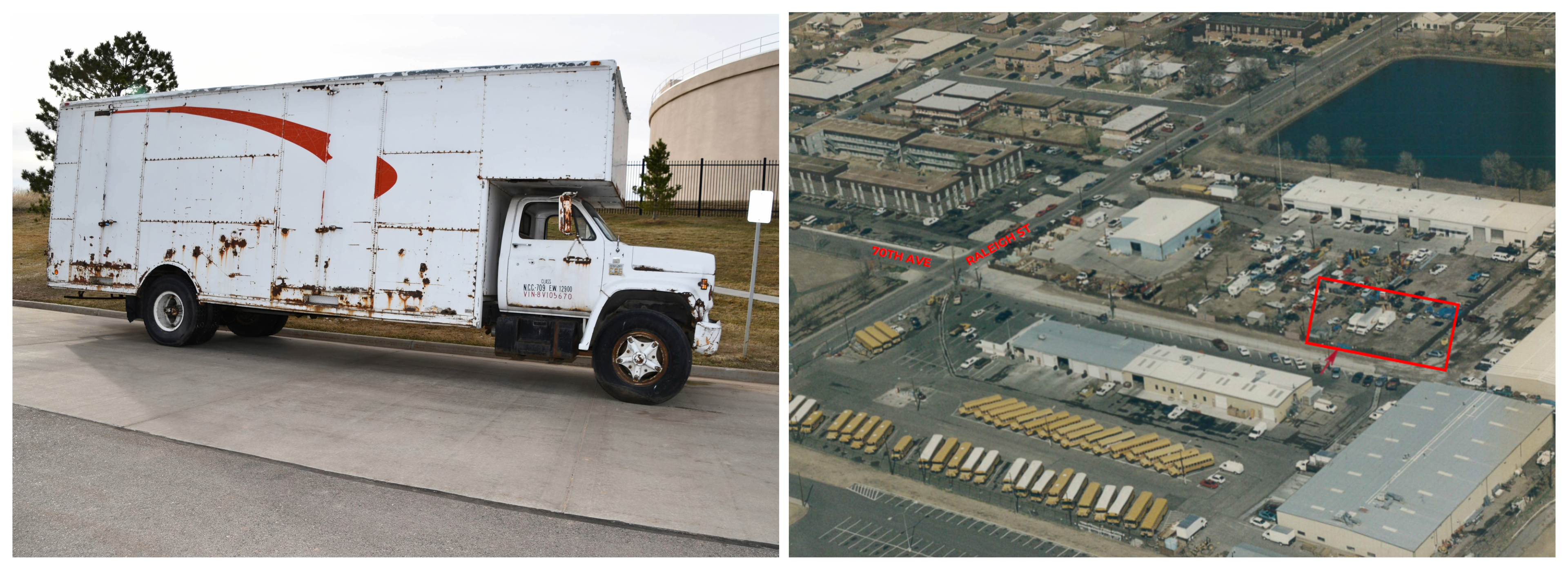 Left: The moving truck that Paul, Sarah and Lorenzo were driving on February 7, 1999. Right: The truckyard where the victims were believed to be killed, in the 7100 block of Raleigh Street in Westminster.