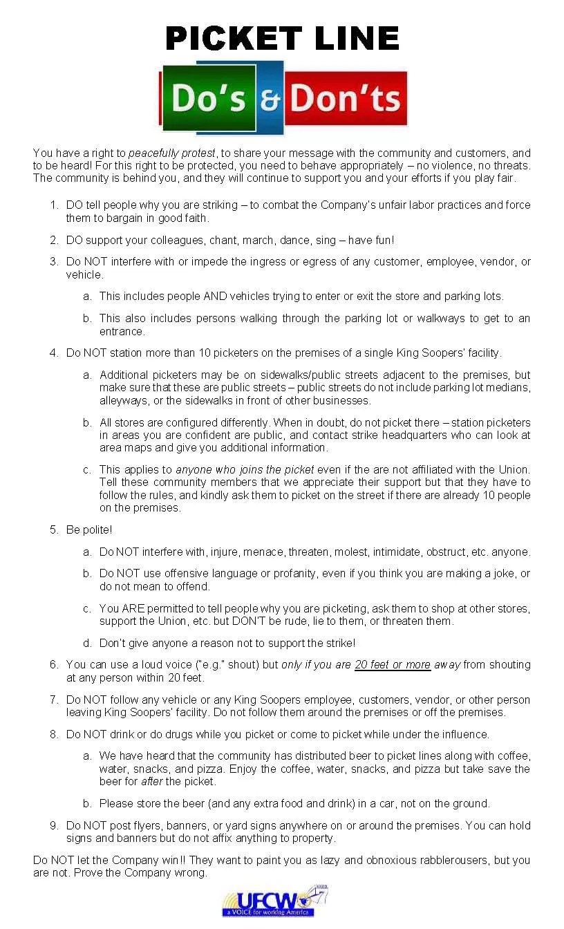 The union responded with the picketing guidelines, which remind members that “you have a right to peacefully protest, to share your message with the community and customers, and to be heard! For this right to be protected, you need to behave appropriately – no violence, no threats. The community is behind you, and they will continue to support you and your efforts if you play fair.”